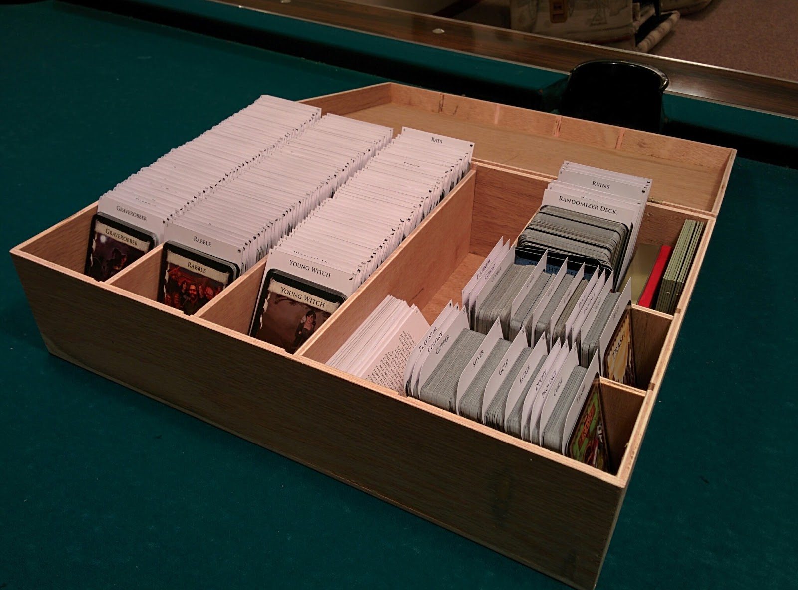 There are 8 expansions to the original Dominion game. I now have 5 of them. You can see (some of) the boxes stacked up on the counter in the background of the photo above. The box that Dominion comes in is huge and mostly full of air. Add on another 5 expansions, and the possibility of portability becomes prohibitively preposterous.