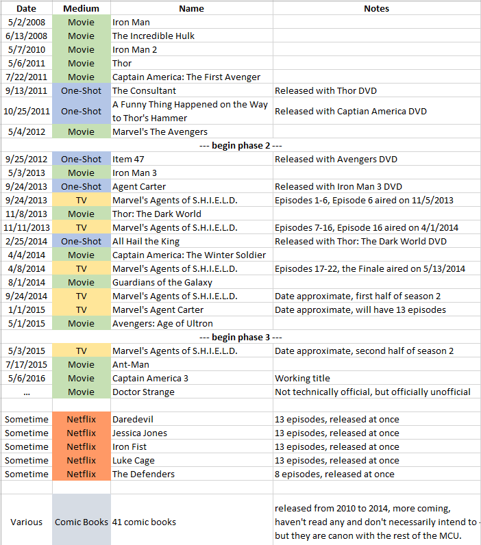 If you don’t care about Marvel Comics, this post might not be for you. If you intend to, but haven’t yet seen everything in the Marvel Cinematic Universe (MCU), this might not be a smart read. This Column will contain no spoilers for the “Marvel’s agents of S.H.I.E.L.D.”. No worries there. The last time I wrote about the MCU, I said that Agents of S.H.I.E.L.D. was floundering, but I was sticking with it. I was impressed with Thor 2 and was looking forward to Captain America 2. Since that time, several things have happened: 1. Agents of S.H.I.E.L.D. started to get a little better 2. Captain America: The Winter Soldier came out, was awesome 3. Agents of S.H.I.E.L.D. was force to turn on its head to deal with the fallout of Cap 2, everything changed for the better and changed for good. 4. Captain America 3 was officially announced. 5. Agents of S.H.I.E.L.D. season One came to a close, had huge impacts on the rest of MCU. Here’s the official timeline of MCU entries (2008-2016):