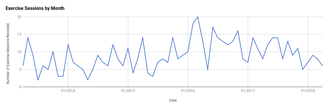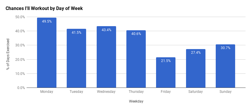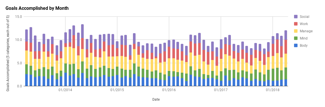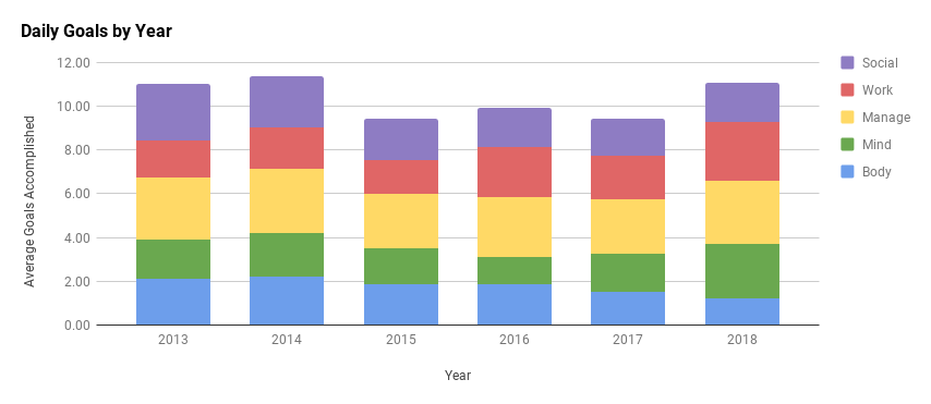 That’s what I set out to do… and that’s what I achieved. I failed on exactly zero of those ambitions. In addition - I found a way to include my weight, sleep, health, happiness, location, steps taken, calories burned, some specific tags for any given day, and finally the weather (cause why not) all while requiring less daily maintenance than it did when I started. Nearly half the data today just come in automatically. The spreadsheet has 105 columns, 92,665 individual data points. Here come a ton of graphics.
