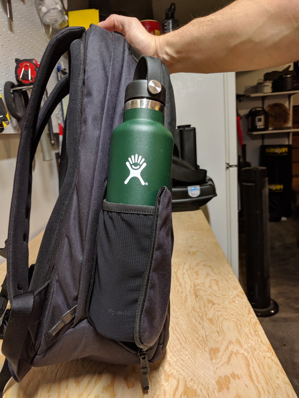 Lastly, there’s the water bottle holder. It zips away and folds flat when not in use. Unzips to an elastic mesh that allows you to comfortably hold a Hydroflask (20/24 oz), or a 20 oz bottle. You can actually force a Nalgene bottle down in there, but it doesn’t feel like it was mean to stretch that much.