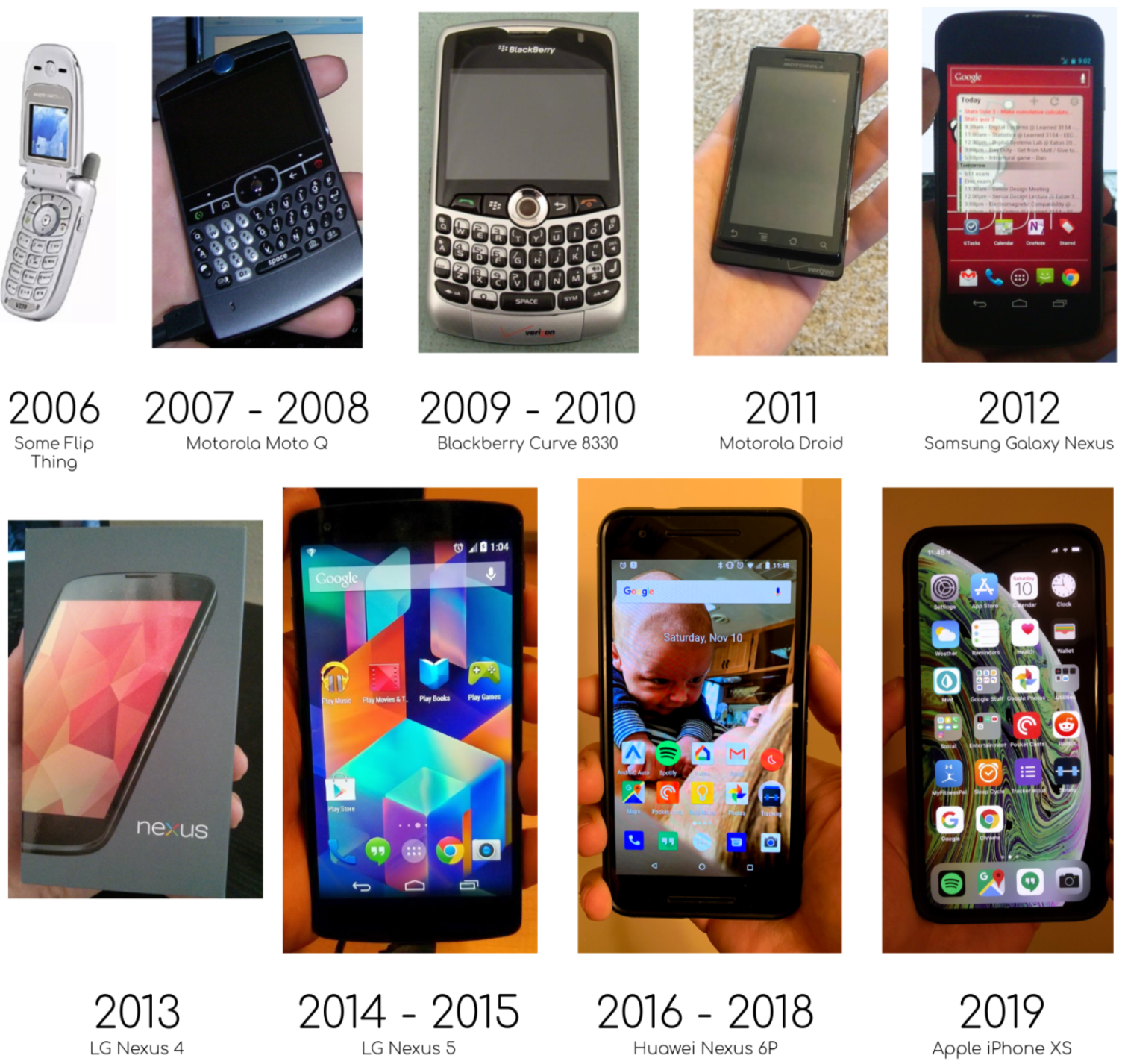 Next was the big one… the biggest jump from one phone to the next. It didn’t happen between the dumb flip phone and the “smart’ Moto Q, it happened between my Blackberry and my first Android phone - the Motorola Droid. This was, and maybe still is, my favorite phone I’ve ever had. It was incredible. It took photos that looked like photos. Its 5MP camera had a flash! It had an internet browser that looked kinda like the actual internet. It had GOOGLE MAPS and GPS! It had a proper headphone jack (RIP). It had a HUGE (3.7”) touch screen, AND a slide-out keyboard so I wouldn’t have to rely on any finicky on-screen keyboards. People weren’t sure how those would play out yet at the time. I distinctly remember when my PlayStation 3 was still new, yet my cousins and I took turns playing with their new phones more than the PlayStation. They were just unlike anything anyone had ever seen before (other than the iPhone, but who could afford an iPhone - they were like $600! for a phone!). This represented a jump in phone technology that I think hasn’t really been replicated since, and may never be. Suddenly a phone went from being just a phone to being a phone, a GPS, a camera, a gameboy, a flashlight, and a Google machine.