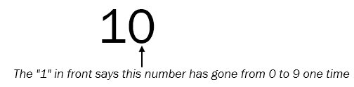 We call that number “ten”. So the new spot, to the left of the first digit, we call the “tens” position. We name all the number positions after the first number that makes that position go from 0 to 1. That means when you first start counting, the first time you count up to 9, you’ve been counting in the _ones_position. Once you count past that 9, you mark a “1” in the tens position. You count again from 0 to 9 in the ones position, then change the tens position to “2” (twenty) to indicate you’ve counted the digit in the ones position from 0 to 9 two times. Once the tens position number has gone from 0 to 9, you put a “1” in a position to the left of the tens position, to show that you’ve gone through it.