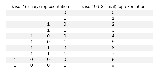 There’s no reason we have to use the symbols 0, 1, 2, 3, 4, 5, 6, 7, 8, and 9. We can count the exact same way just using 0 and 1. That’s how we count inside computers. We call it “binary”.