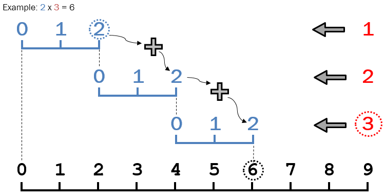 Multiplication is just repeated addition. You add one number to itself over and over, counting the number of times you do it, until you count to the other number. Then you see where you end up.
