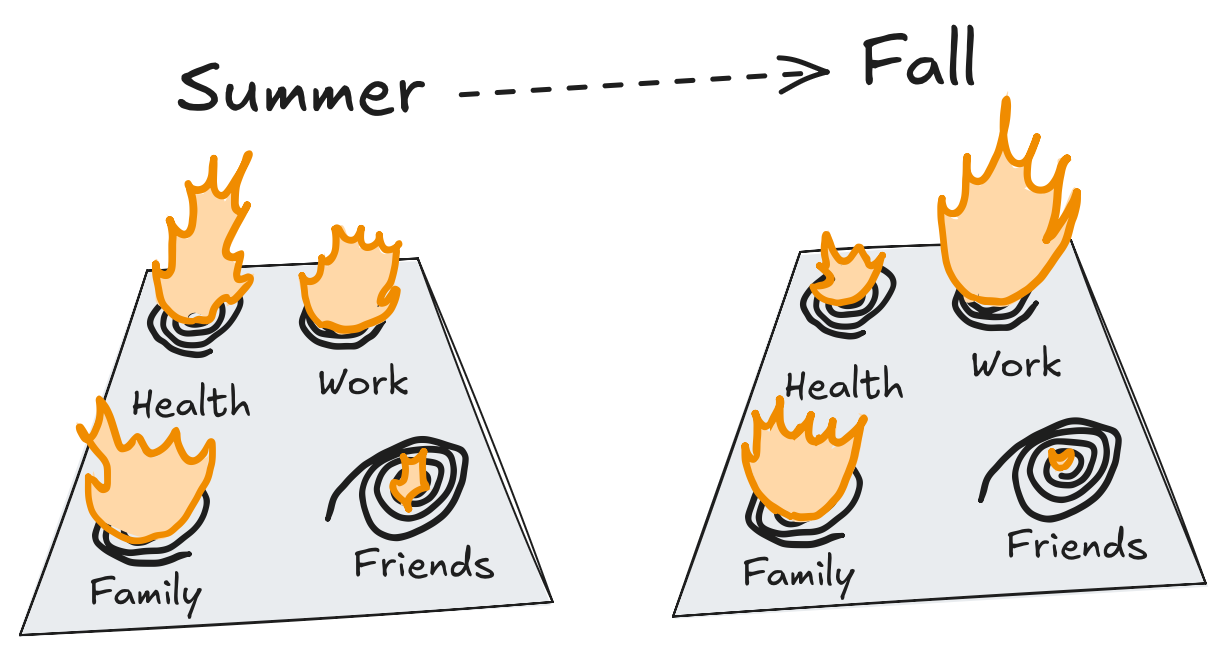 There’s a fairly well-known framework called “The 4 Burner Theory”. It posits you can think about your life as a 4 burner gas stove. Each burner represents something: